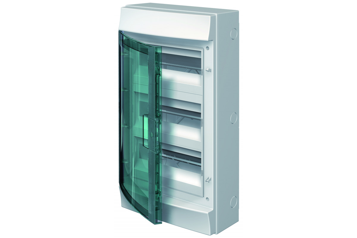 Stromkreisverteiler, Baureihe Mistral 65, Anbaumöglichkeit: seitlich und unten, Montageart: Aufputz, für den Innenbereich, mit Tür, Schutzklasse II (schutzisoliert), Schutzart IP65, geltende Normen: DIN EN 60670-1; VDE 0606-1, DIN EN 60670-24; VDE 0606-24, IK-Code 9, Bemessungsbetriebsspannung Ue 400V AC 50/60 Hz, Bemessungsstrom In 125 A, Glühdrahtfestigkeit 750°C, in RAL 7035, Gehäuse aus Polystyrol, Transparente einflüglige Tür, Tür aus Thermoplast, in RAL PETROLBLAU, mit Schnappverschluss, Türöffnungswinkel 180 Grad, Türanschlag rechts oder links, Leitungseinführung oben über Vorprägungen, unten über Vorprägungen, seitlich über Vorprägungen, Abmessungen in mm (H x B x T): 600 x 320 x 155, 3-reihig, Platzeinheiten 36, Reihenabstand: 125 / 150, Abdeckungen aus Kunststoff, unverlierbaren Schrauben, mit N/PE Quick-Steckklemme, Geräteträger herausnehmbar