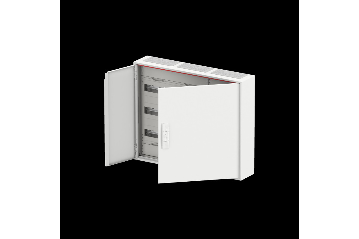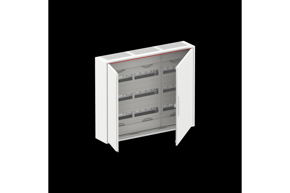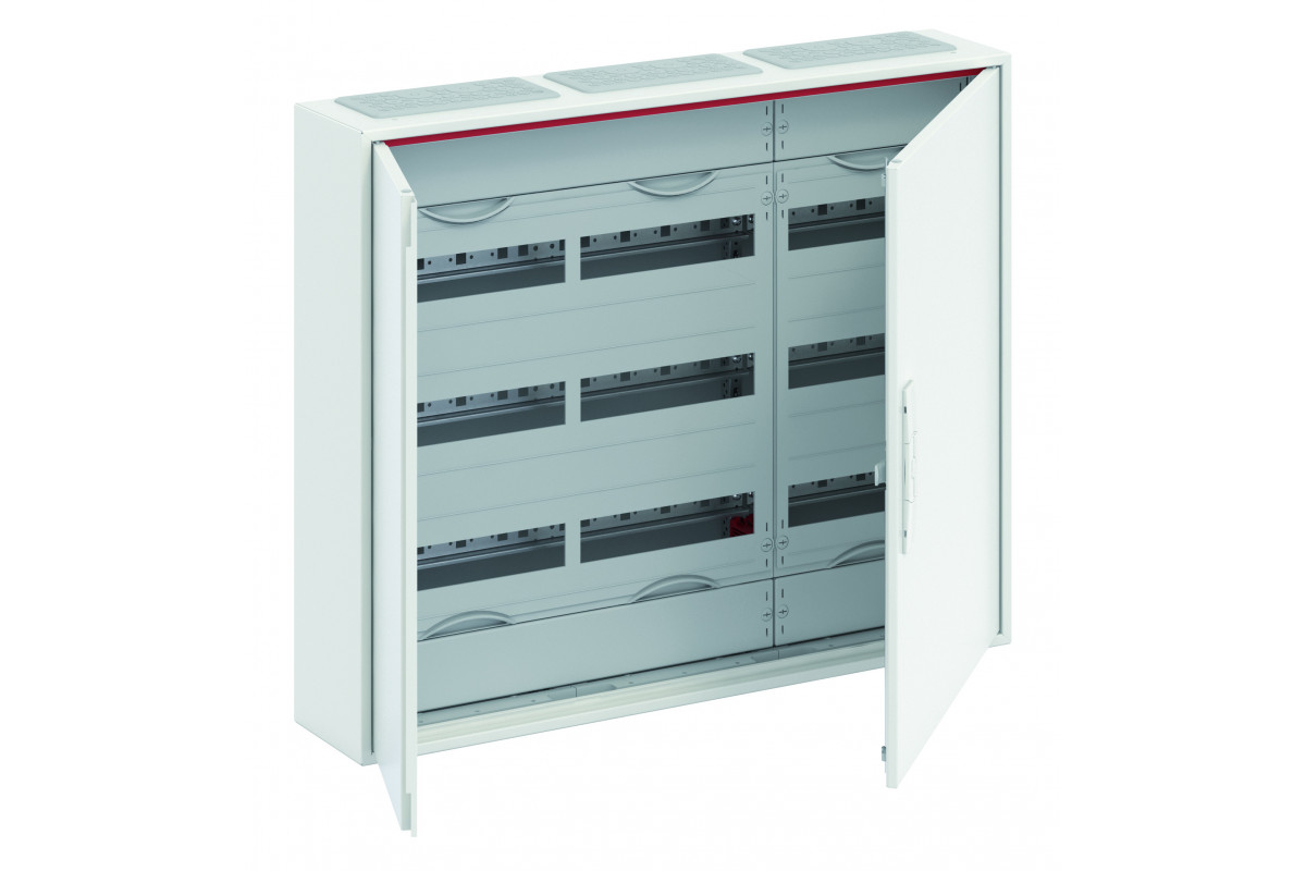 Kleinverteiler, teilausgebauter Schrank, Anbaumöglichkeit: oben und unten, Montageart: Aufputz, für den Innenbereich, mit Tür, Schutzklasse II (schutzisoliert), in Verbindung mit Erdungsset (Zubehör) Schutzklasse I möglich, Schutzart IP44, geltende Normen: DIN EN 61439-1, VDE 0660-600-1, DIN EN 61439-3, VDE 0660-600-3, Bemessungsbetriebsspannung Ue 400V AC 50/60 Hz, Bemessungsstrom In 125 A, pulverbeschichtet, in RAL 9016, Gehäuse aus Stahlblech, Doppeltür, Tür aus Stahlblech, in RAL 9016, mit Standardverschluss, Türöffnungswinkel 120 Grad, Türanschlag rechts und links, Leitungseinführung oben über Membranflansch montiert, unten über Flanschöffnung vorgeprägt, Abmessungen in mm (H x B x T): 650 x 800 x 160, Rasteinheit 3 RE, Feldbreite 3, 3-reihig, Platzeinheiten 108, Reihenabstand: 150, Abdeckungen aus Kunststoff, 90 Grad Druck-Drehverschluss, RAL 7035, mit N/PE Quick-Steckklemme, Kabelabfangschiene integriert, ausgebaut mit Verteilerfeld, Geräteträger herausnehmbar