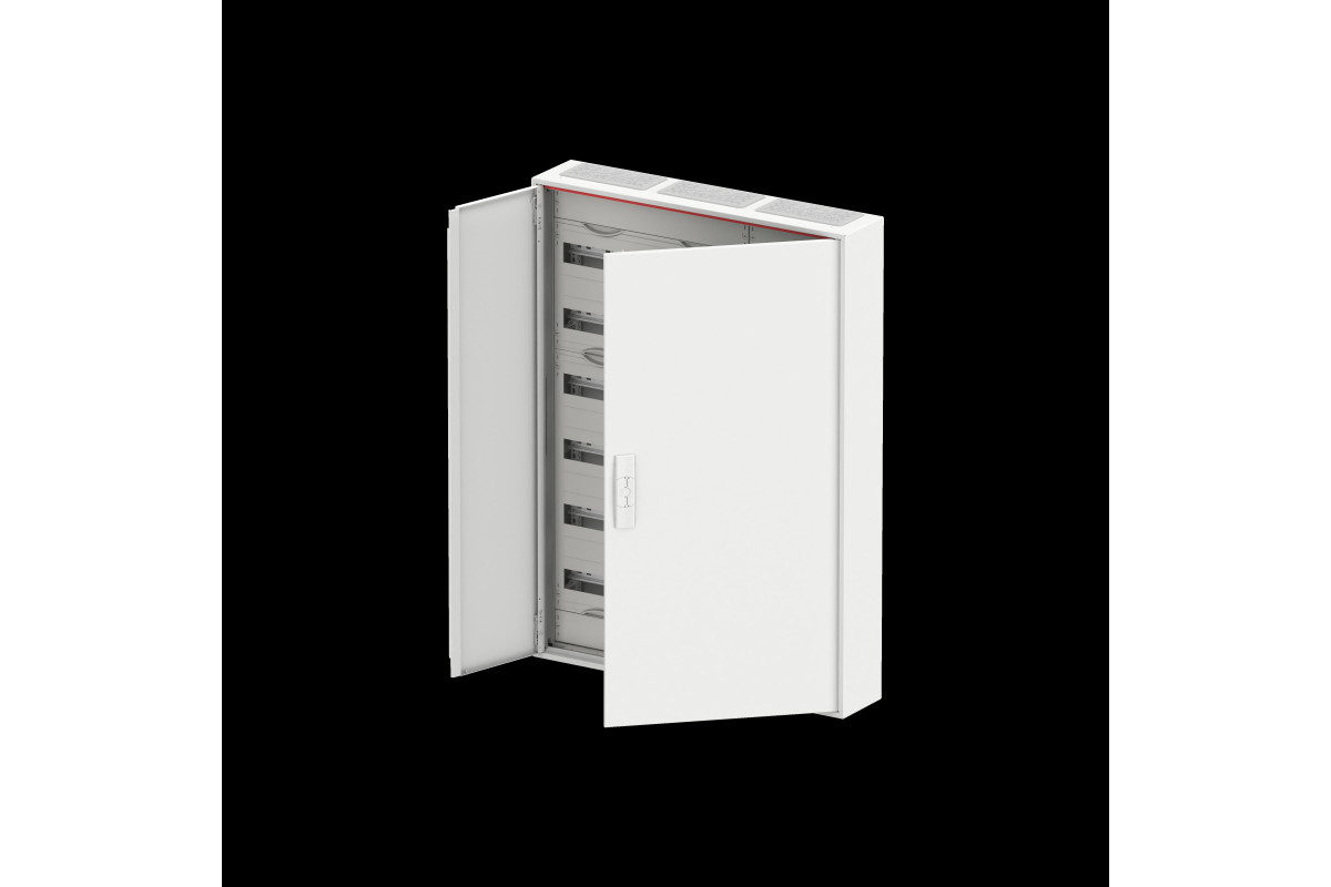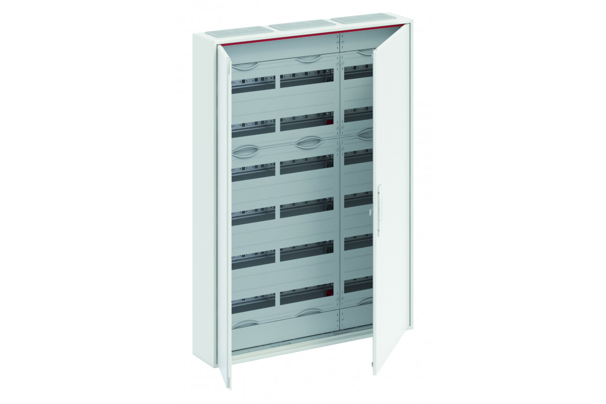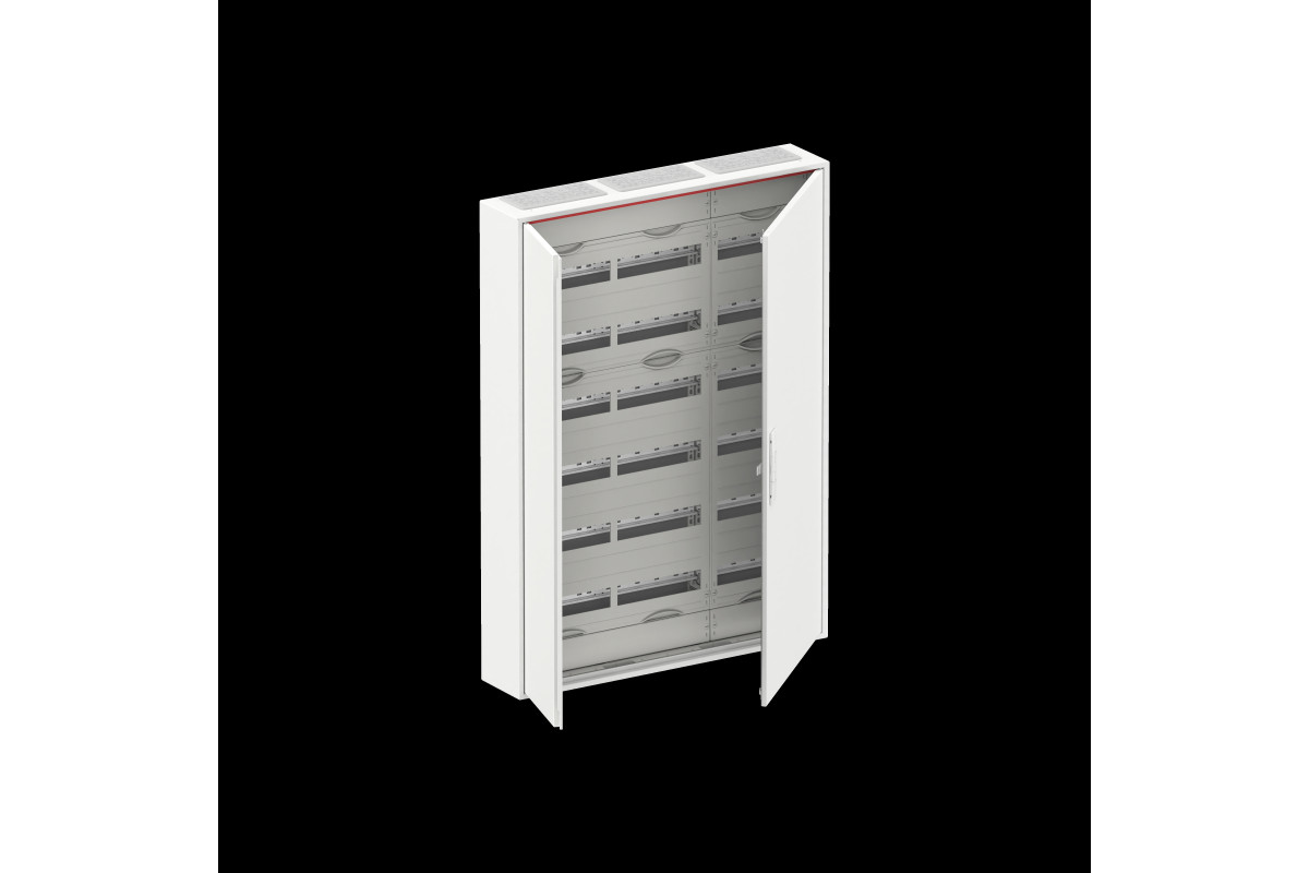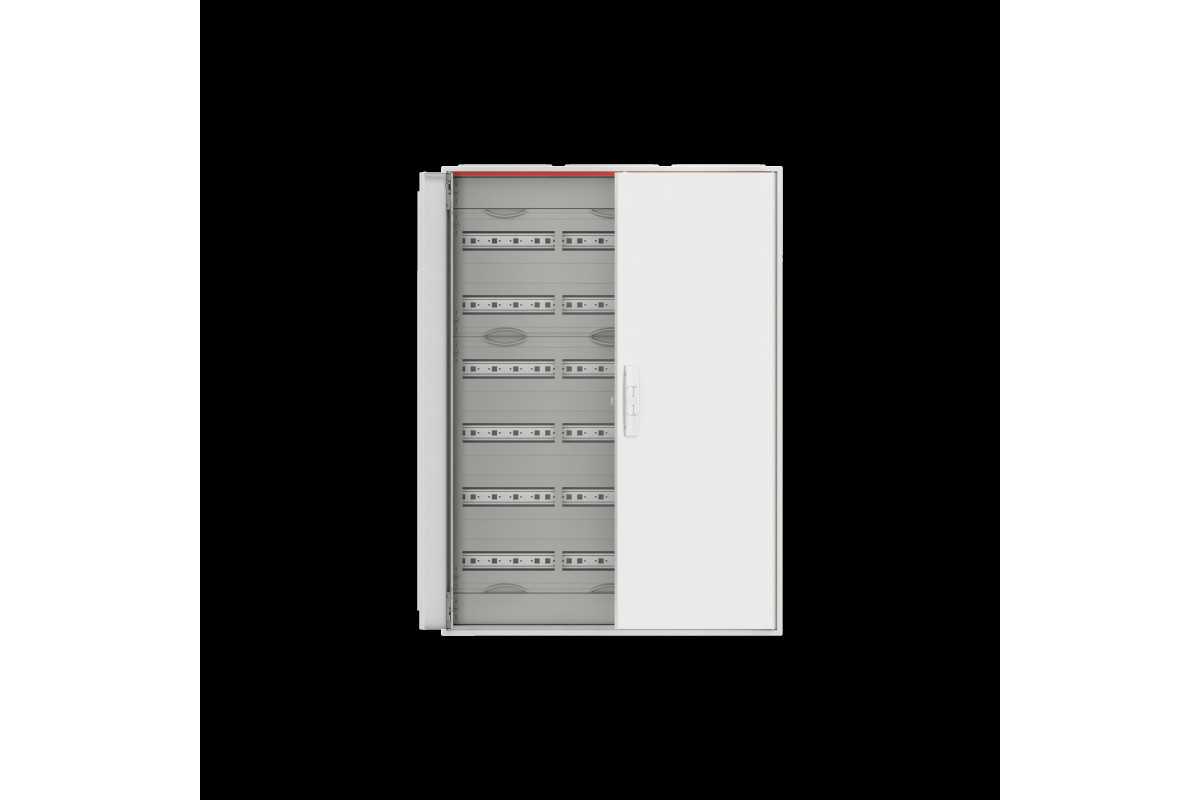 Kleinverteiler, teilausgebauter Schrank, Anbaumöglichkeit: oben und unten, Montageart: Aufputz, für den Innenbereich, mit Tür, Schutzklasse II (schutzisoliert), in Verbindung mit Erdungsset (Zubehör) Schutzklasse I möglich, Schutzart IP44, geltende Normen: DIN EN 61439-1, VDE 0660-600-1, DIN EN 61439-3, VDE 0660-600-3, Bemessungsbetriebsspannung Ue 400V AC 50/60 Hz, Bemessungsstrom In 125 A, pulverbeschichtet, in RAL 9016, Gehäuse aus Stahlblech, Doppeltür, Tür aus Stahlblech, in RAL 9016, mit Standardverschluss, Türöffnungswinkel 120 Grad, Türanschlag rechts und links, Leitungseinführung oben über Membranflansch montiert, unten über Flanschöffnung vorgeprägt, Abmessungen in mm (H x B x T): 1100 x 800 x 160, Rasteinheit 7 RE, Feldbreite 3, 6-reihig, Platzeinheiten 216, Reihenabstand: 150, Abdeckungen aus Kunststoff, 90 Grad Druck-Drehverschluss, RAL 7035, mit N/PE Quick-Steckklemme, Kabelabfangschiene integriert, ausgebaut mit Verteilerfeld, Geräteträger herausnehmbar